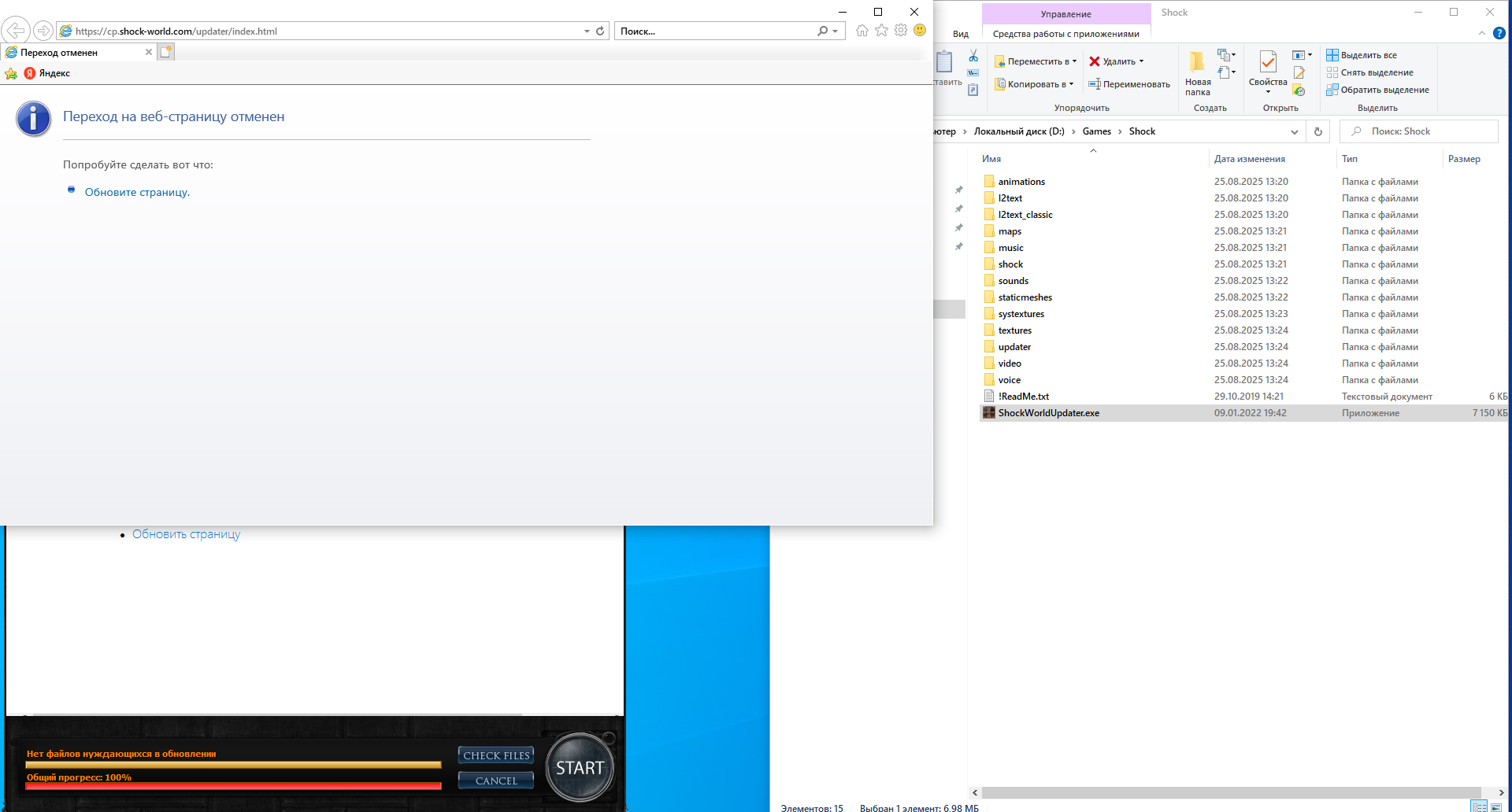 lad 179 Report post Posted August 25, 2025 добавить следующие папки и файлы в исключения защитника, антивируса, брандмауэра: папку с игрой (клиент) папку system (отдельно) ShockWorldUpdater.exe (находится в корневой папке) ogg.dll (находится в папке system); Shock.dll (находится в папке system). Quote Share this post Link to post Share on other sites